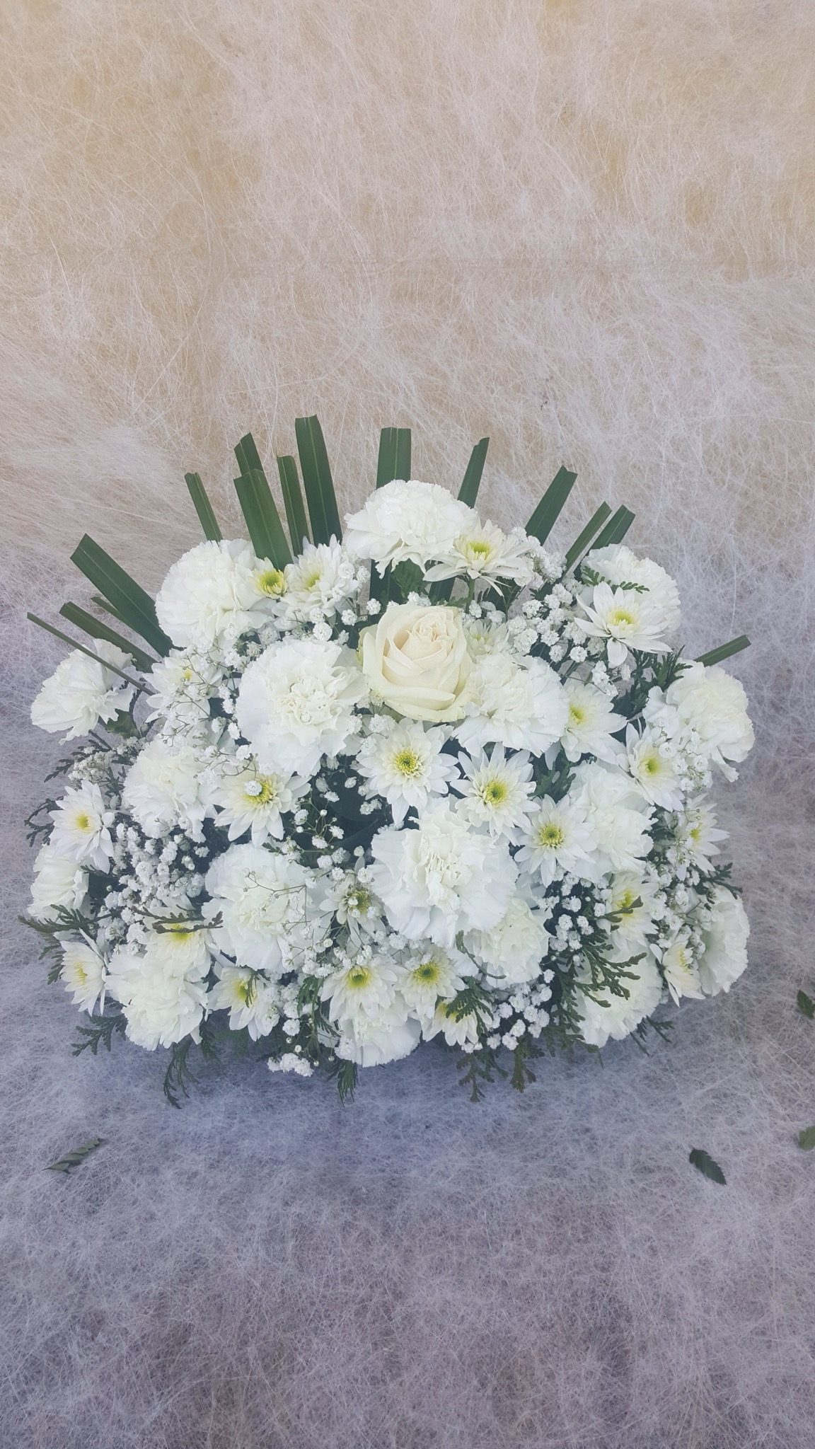 InicioCentro de Flores Centro(3B): base estrecha con 18 claveles ,una rosa blanca, margaritas y paniculata – todo en blanco