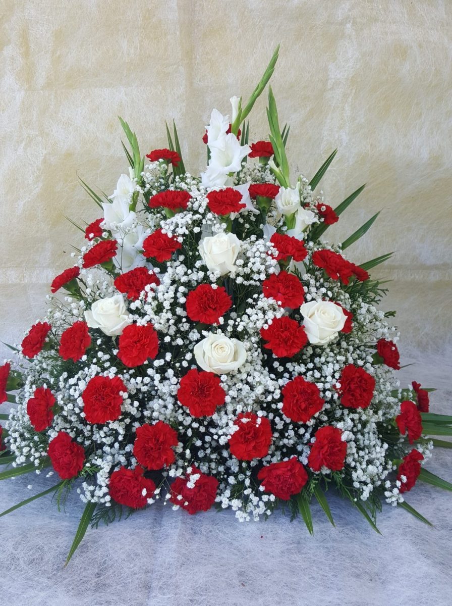 Centro(3B): base estrecha con 18 claveles ,una rosa blanca, margaritas y paniculata – todo en blanco