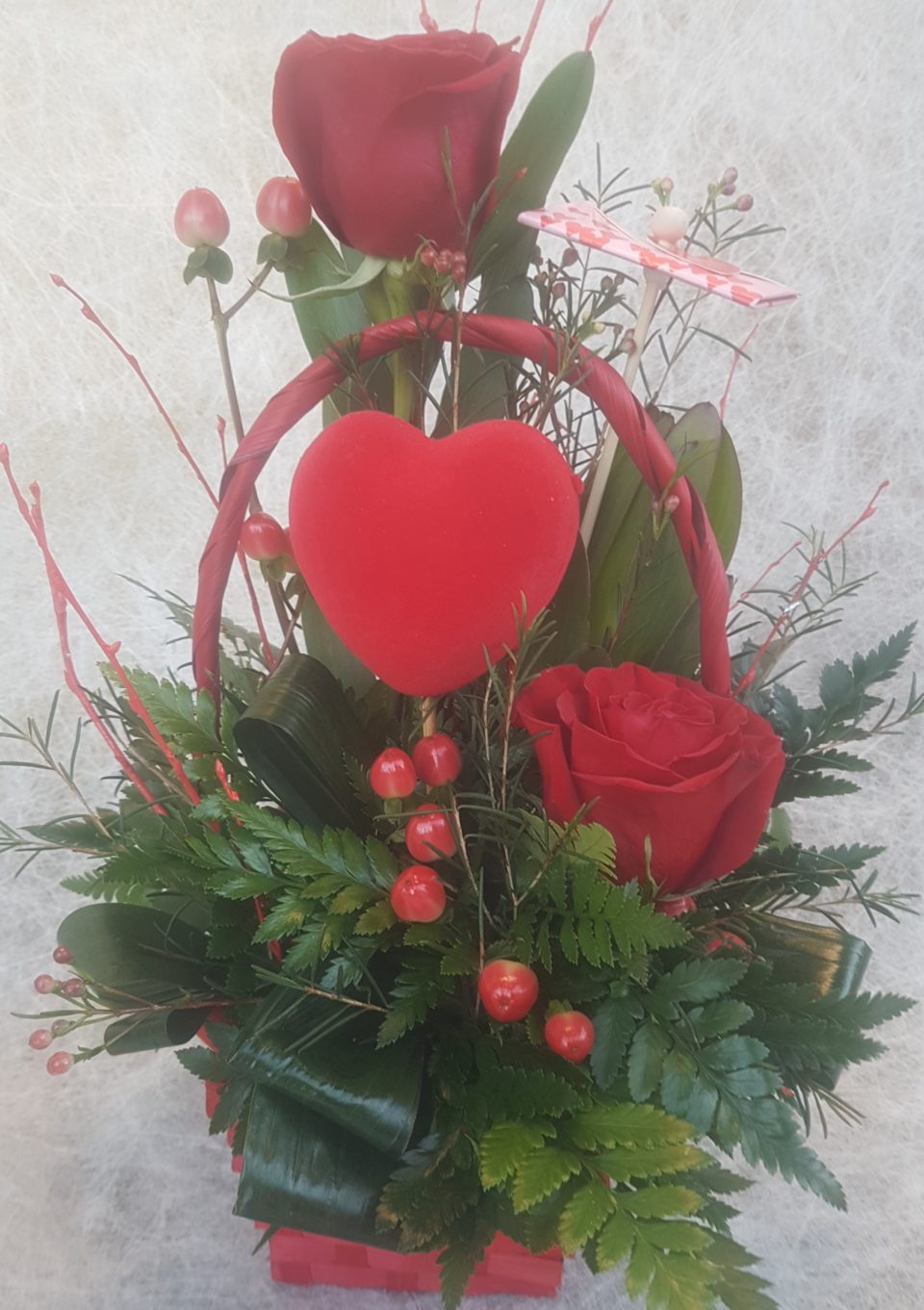 Cesta(6): 2 rosas rojas, hiperico rojo,verdes,cesta de mimbre roja y tarjeta