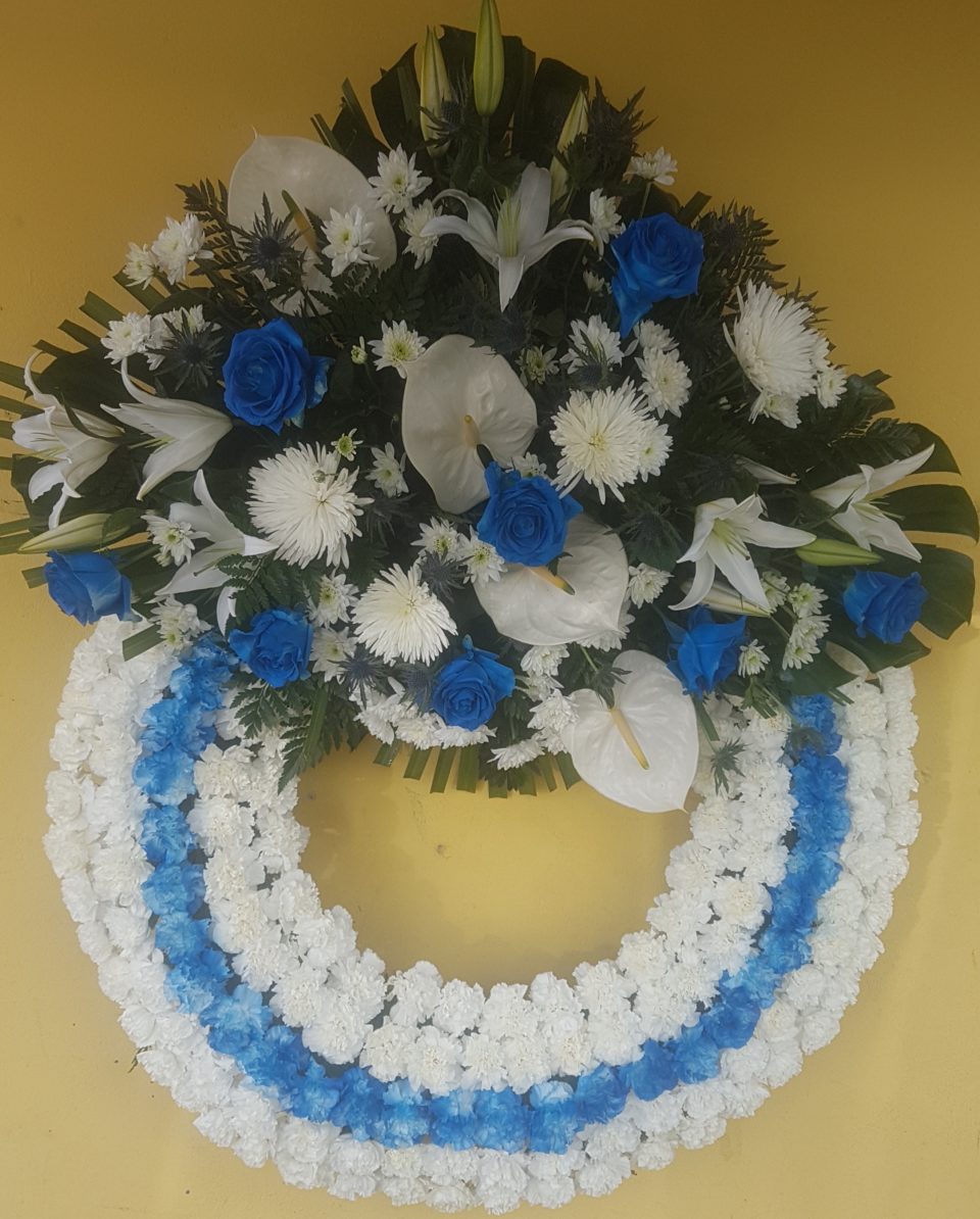 Aro de 80 cms. de 5 filas de claveles blancos y blancos tintados de azul y un cabezal grande de flor variada ( rosas,orientales,anturios y anastasias).