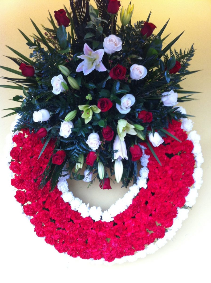 Aro de 80 cms. de 5 filas de claveles rojos y blancos y un cabezal grande de rosas blancas y rojas y orientales.