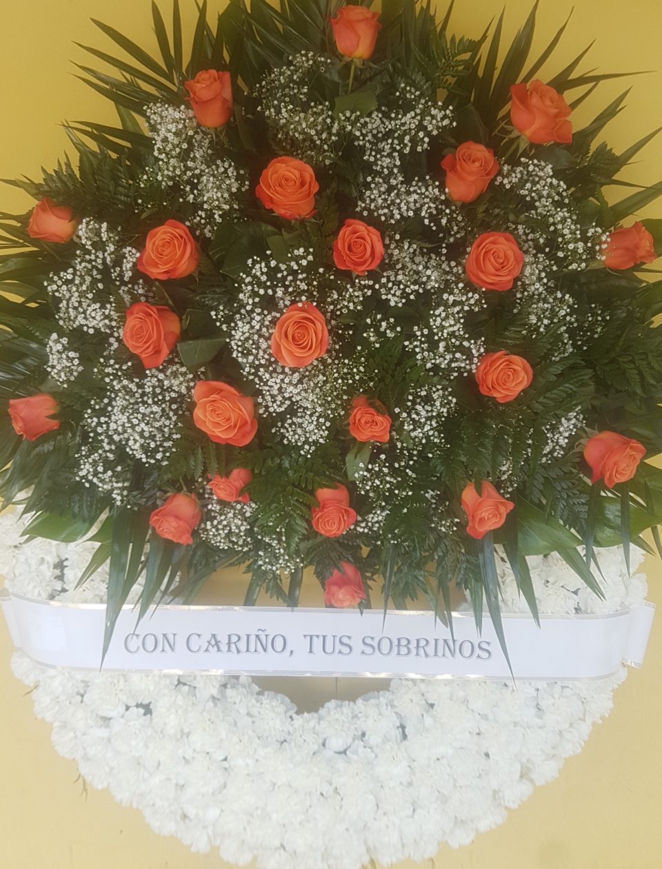 Aro de 80cms de 5 filas de claveles blancos y un cabezal grande de 24 rosas naranjas(color según disponibilidad).