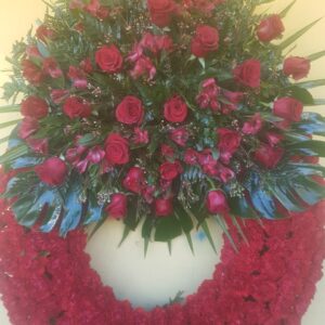 Corona (5R): Aro de 80cms. de 5 filas de claveles rojos y 2 cabezales (uno grande y otro más pequeño) de flor variada (orientales, rosas, anturios, gerberas). 250,00€
