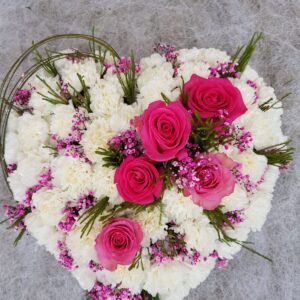 Corazón(2): claveles bancos y 5 rosas fucsia (colores segun disponibilidad)