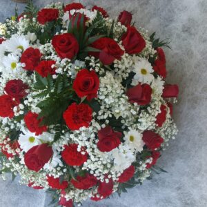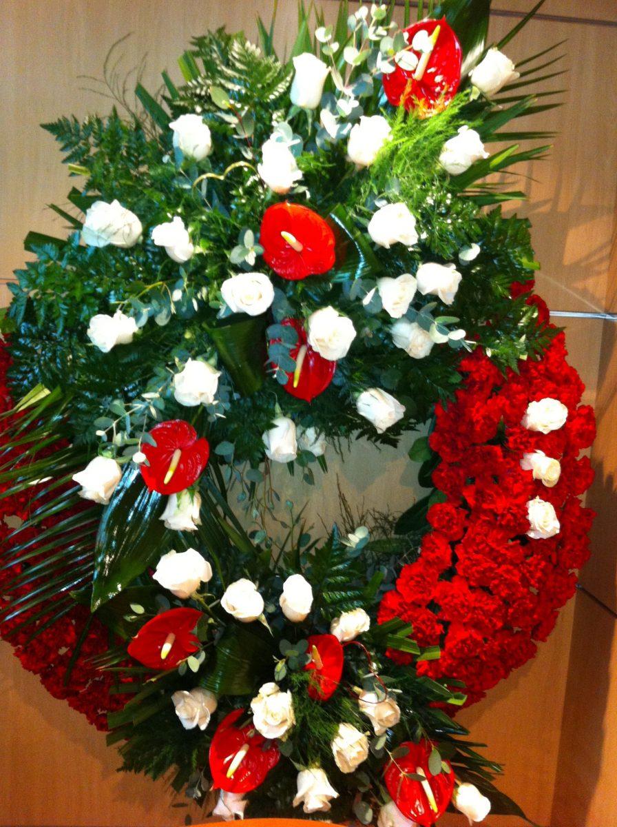 Aro de 80cms. de 5 filas de claveles rojos y 2 cabezales de rosas blancas y anturio rojo (otros colores, según disponibilidad).