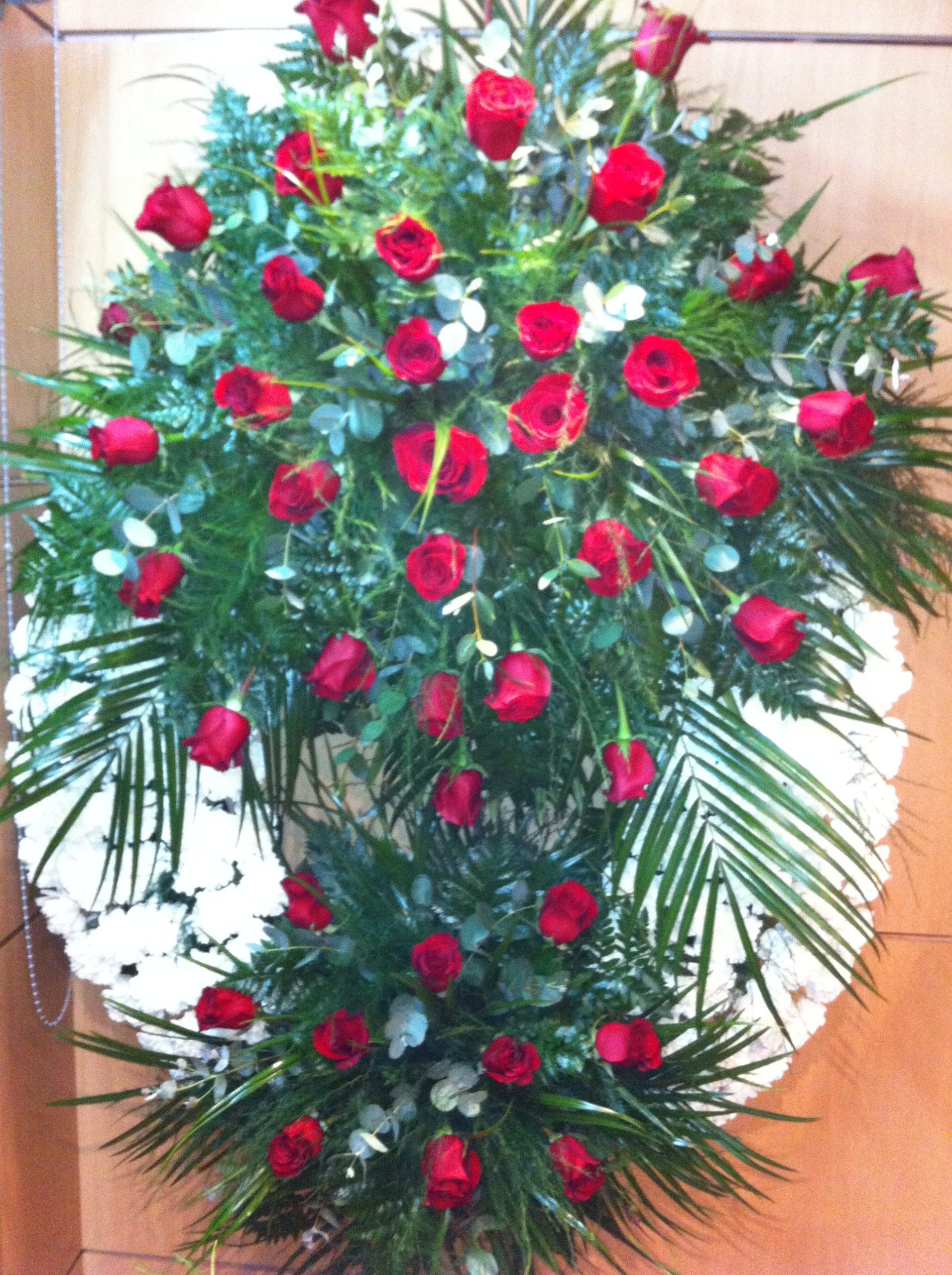 Aro de 80cms. de 5 filas de claveles rojos y 2 cabezales de rosas blancas y anturio rojo (otros colores, según disponibilidad). El precio incluye la entrega a los TANATORIOS de Asturias, cinta y/o tarjeta. ENVIO GRATIS A LOS TANATORIOS DE ASTURIAS.