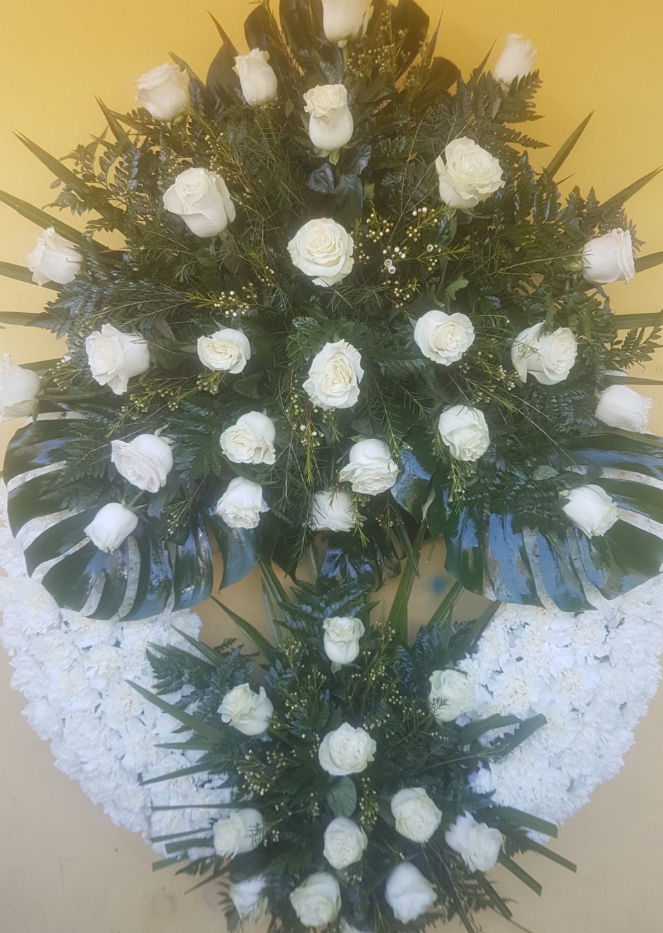 Aro de 80cms de 5 filas de claveles blancos y dos cabezales grandes de rosas rojas. El precio incluye la entrega a los Tanatorios de Asturias, cinta y/o tarjeta. ENVIO GRATIS A LOS TANATORIOS DE ASTURIAS?