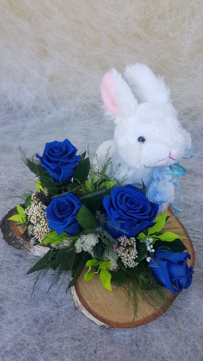 InicioFlores preservadas Madera(1):4 Rosas y verdes preservados sobre base de madera con peluche