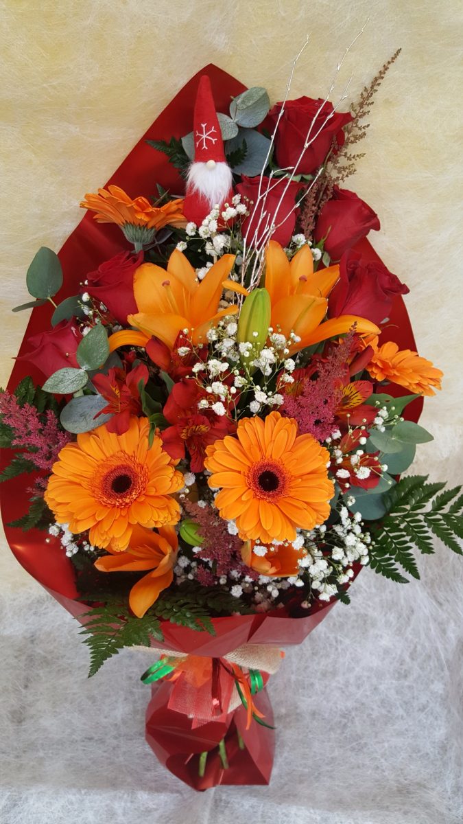 Ramo(10): 7 rosas rojas, 2 liliums, margarita ,pani y verdes y detalles.( Los colores se pueden elegir según disponibilidad)